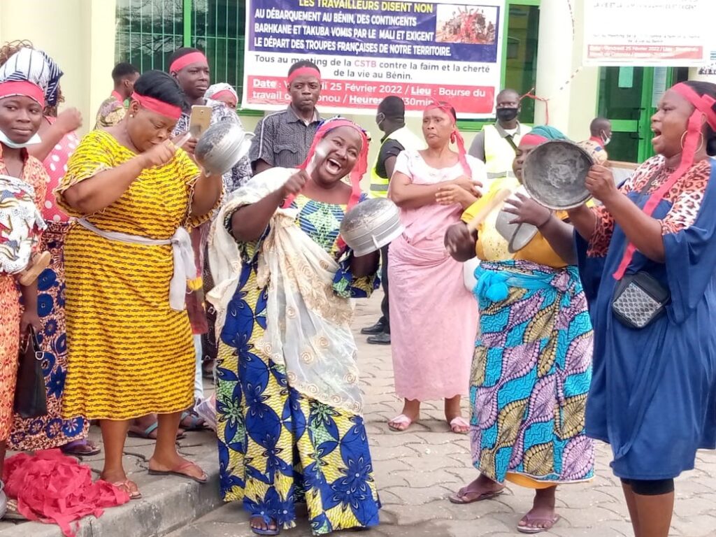Financiers, dockers, releveurs de la Sobemap, enseignants ou agents de la santé et même les femmes du marché et ouvriers étaient présents à ce meeting. Bandeau rouge ceinturant les têtes, les hommes brandissaient des pancartes et les femmes tapaient à l’aide de louches des casseroles vides en chantant. « Talon, maïs et gari sont devenus de l’or au Bénin, les travailleurs n’en peuvent plus, trop c’est trop », « Non aux troupes françaises au Bénin » pouvait-on lire des pancartes.